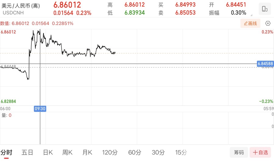 好意思元兑离岸东说念主民币汇率盘中破6.86元。